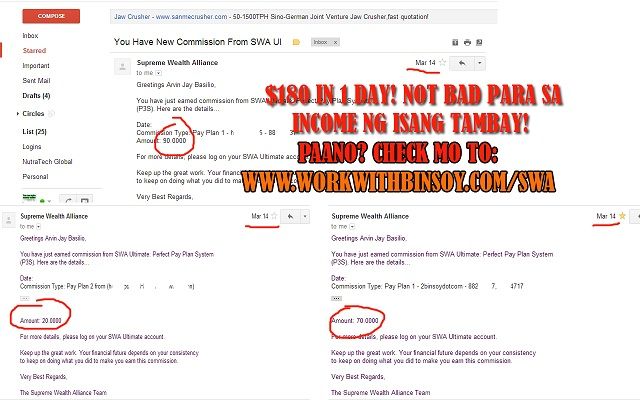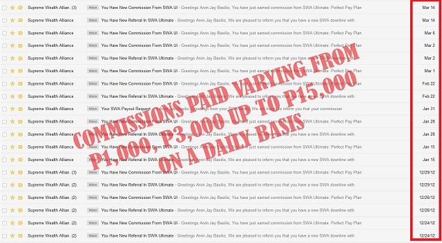 Hindi ako makapaniwala na sa loob lang ng (6) anim na araw ako ay kumita na ng $90 dollars galing sa Supreme Wealth Alliance. Maligayang maligaya ako ng makita ko ang email ko na mayroon dumating na notification na nagsasabing may komisyon ako galing sa SWA, hindi ko akalain pwede pala akong kumita ng pera kahit tulog. Alam nyo ba kong bakit ako sumali sa SWA dahil sa kanilang produkto nakakatulong ito ng malaki upang mapalago ko aking kaalaman at ang kanilang perfect pay plan system. I praise the Lord Jesus always for giving me more blessings through SWA.